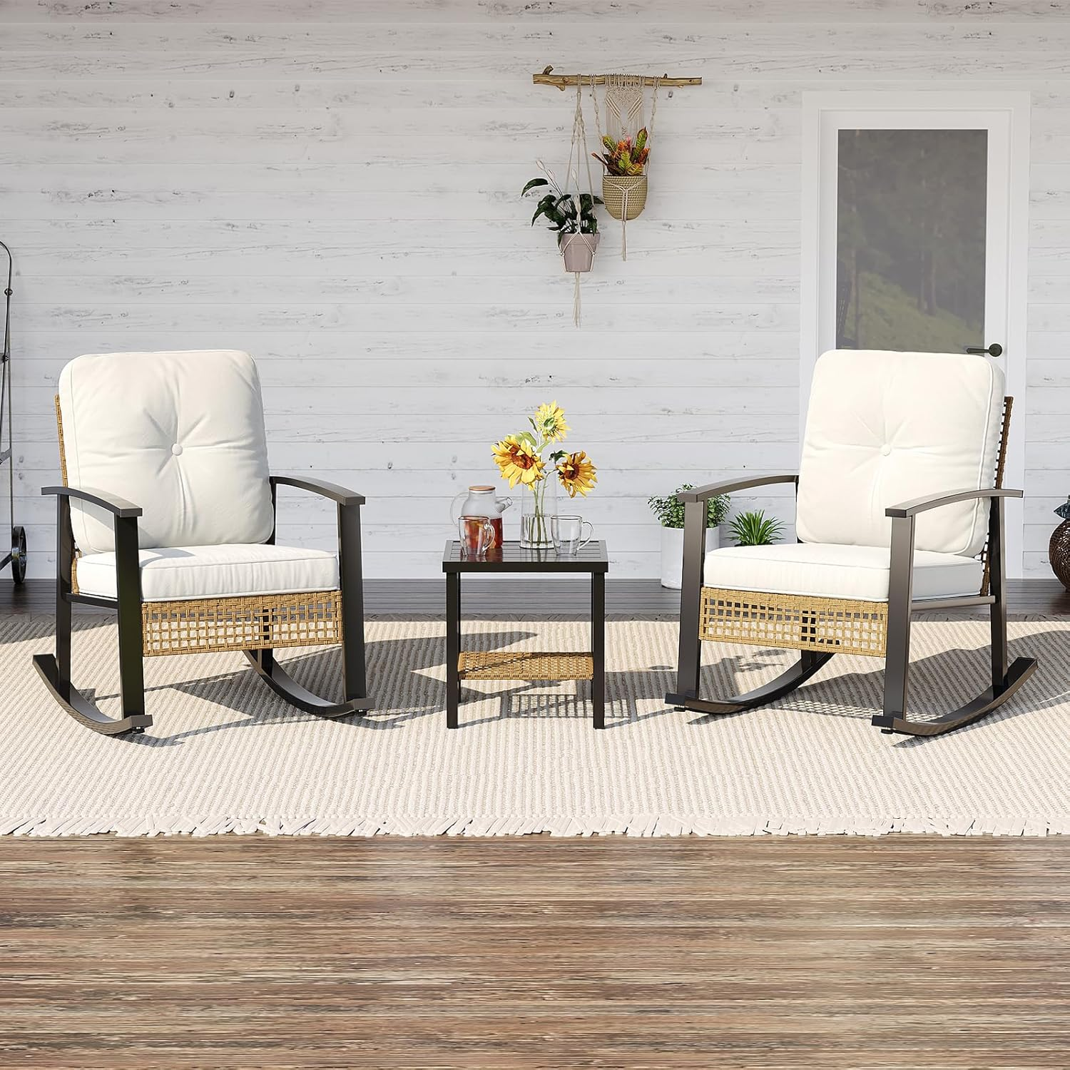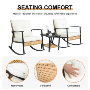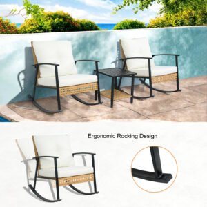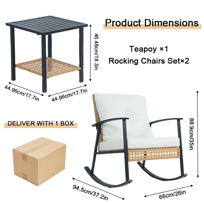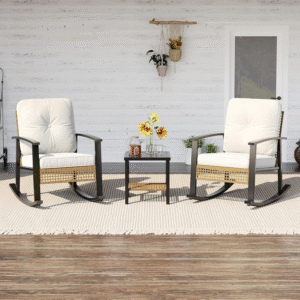Create intimate moments in your private garden oasis. This elegant metal set features two comfortable rocking chairs for you and a partner to relax, chat, or read, paired with a matching side table for drinks and snacks. Durable construction ensures lasting enjoyment in your dedicated romantic or leisure patio nook.