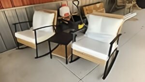I ordered this blue sofa because it matches the existing blue patio swivel rockers I have on the front porch of my workshop. What I received was 2 individual rockers with white cushions and a black side table. I sent it back and asked that what I ordered be delivered to me. A week later, I received another set of white cushioned rockers – so I guess I’ll go ahead and give a review of them.