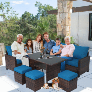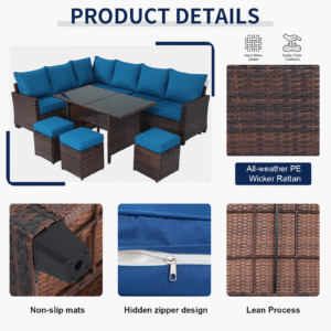 7-Piece Outdoor Sofa Set All-Weather Steel & UV-Stable PE Wicker:Engineered for coastal and desert climates. Triple-layer powder coating enhances corrosion resistance, while dense PE weave maintains color integrity against pool exposure – durable construction for extended backyard use.