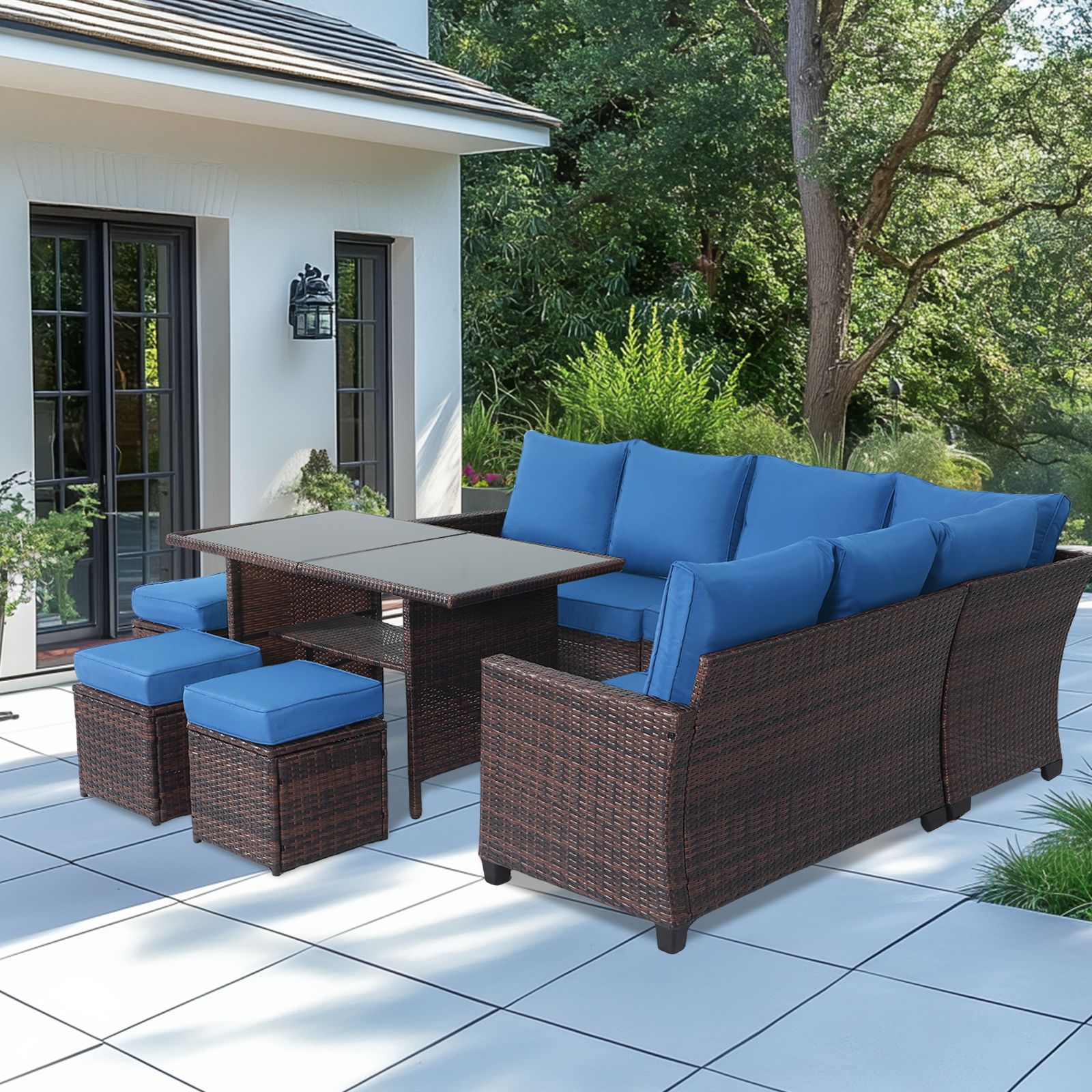 This is a brown wicker outdoor furniture set, including a corner sofa with navy – blue cushions, a extendable table, and storage ottomans. Placed on a tiled patio by a house, it’s perfect for outdoor dining, relaxing, and hosting guests, blending comfort and functionality in a garden setting.
