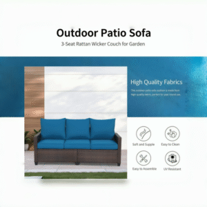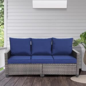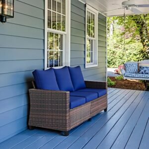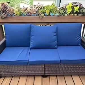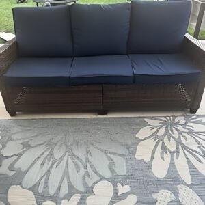 Looks great and feels sturdy! The high back design makes it comfortable for lounging and the water-resistant cushions are a big plus for outdoor use and/or Florida weather. Assembly took a bit longer than expected and it doesn’t come with the hardware you need to put it together. The cushions could be slightly thicker for extra comfort, but overall it’s a stylish and functional piece that works well for me