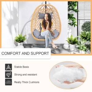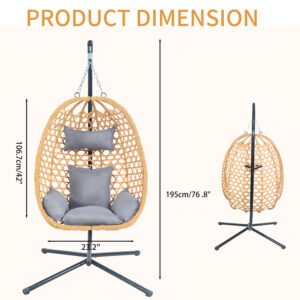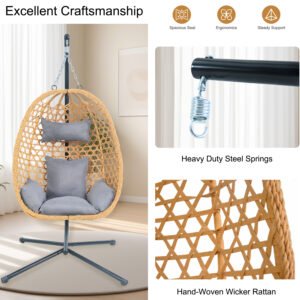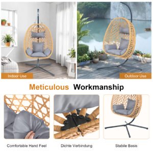 This is a rattan egg – shaped hanging chair with cushions, supported by a metal stand. Ideal for relaxation in gardens or balconies.