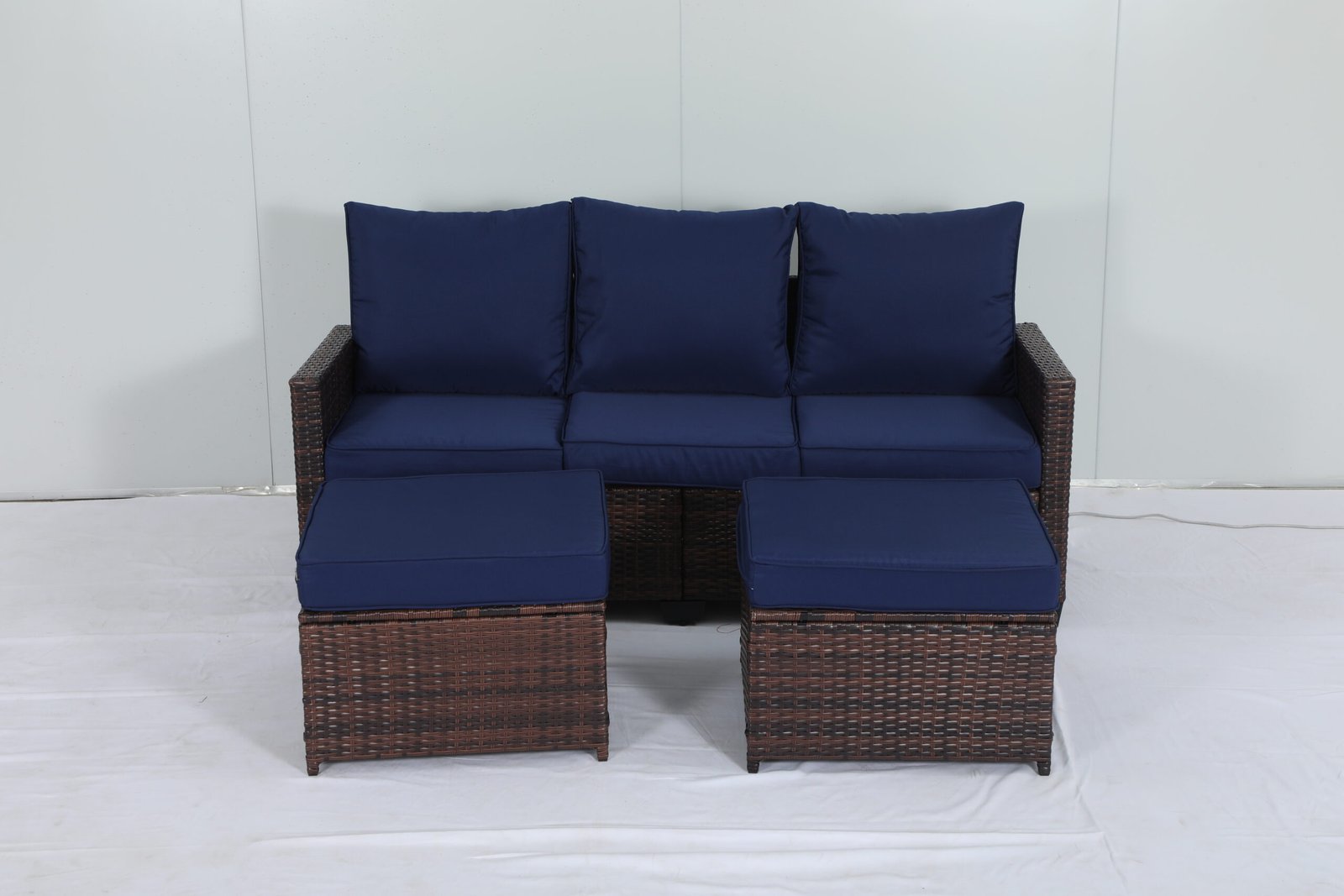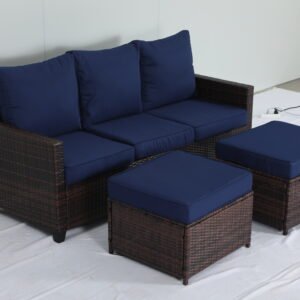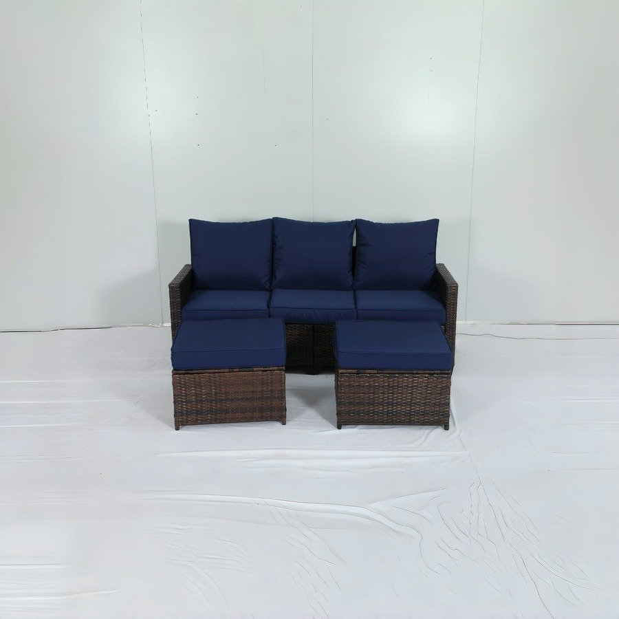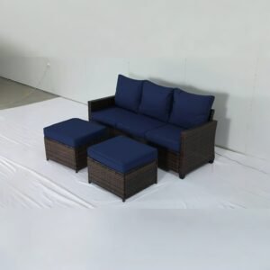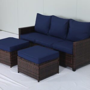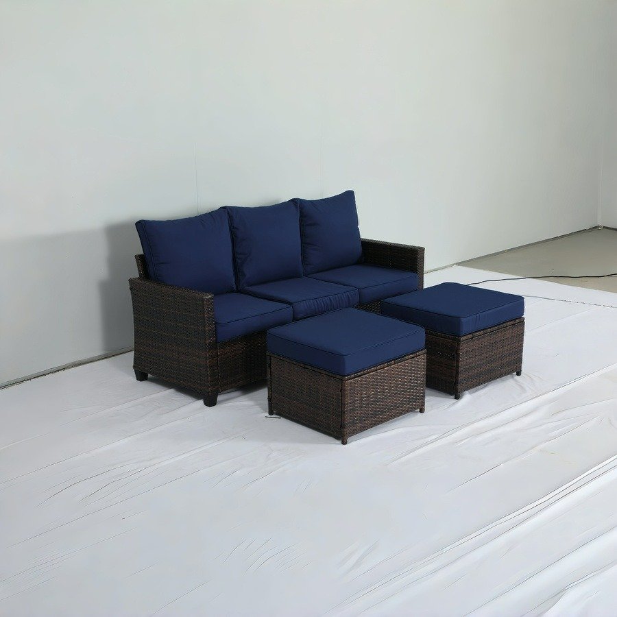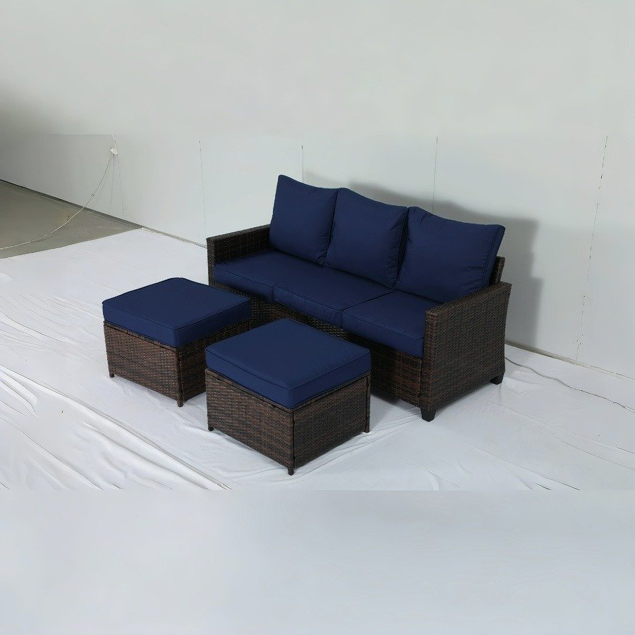 This is an outdoor wicker sofa set, consisting of a three – seater sofa and two ottomans. The frame is dark – brown wicker – like material, paired with navy – blue cushions and backrests. It has a simple style, suitable for outdoor leisure scenes like courtyards and terraces.